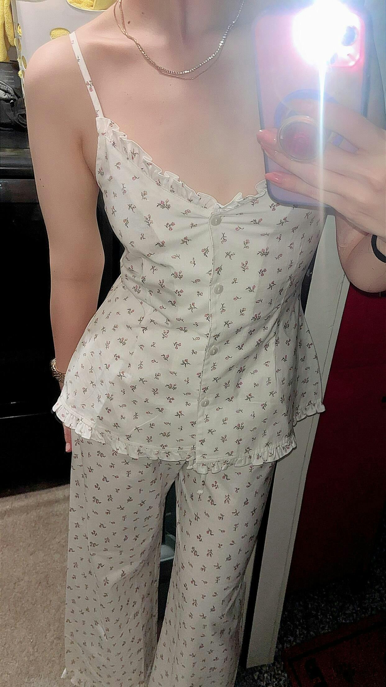 - Complementing the top, the pants are designed in a fashionable capri length, perfect for those warmer nights. The ruffled hem adds a delightful flair, accentuating the playful yet sophisticated nature of the set. For added convenience, the pants come with a drawstring, allowing you to adjust the fit to your preference.